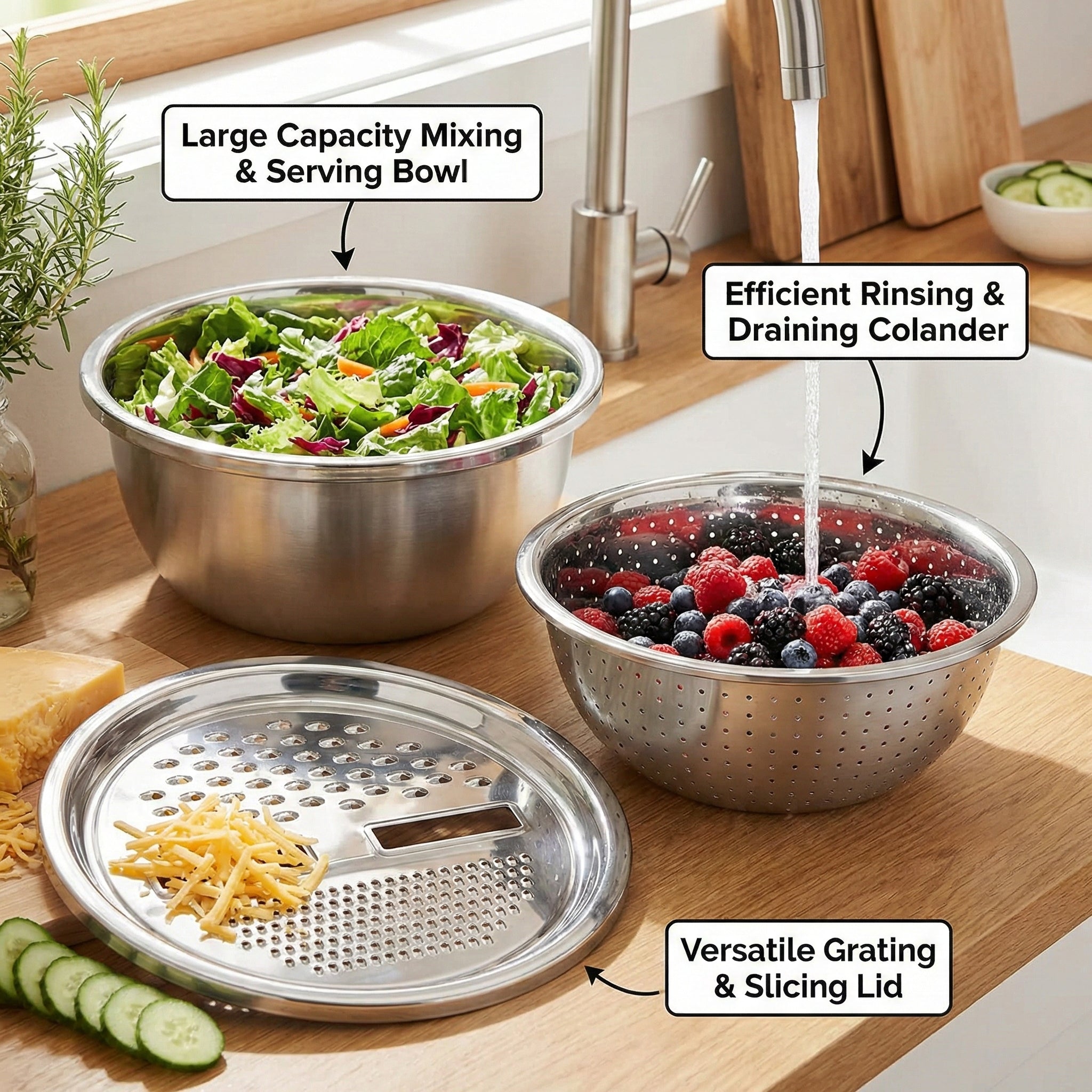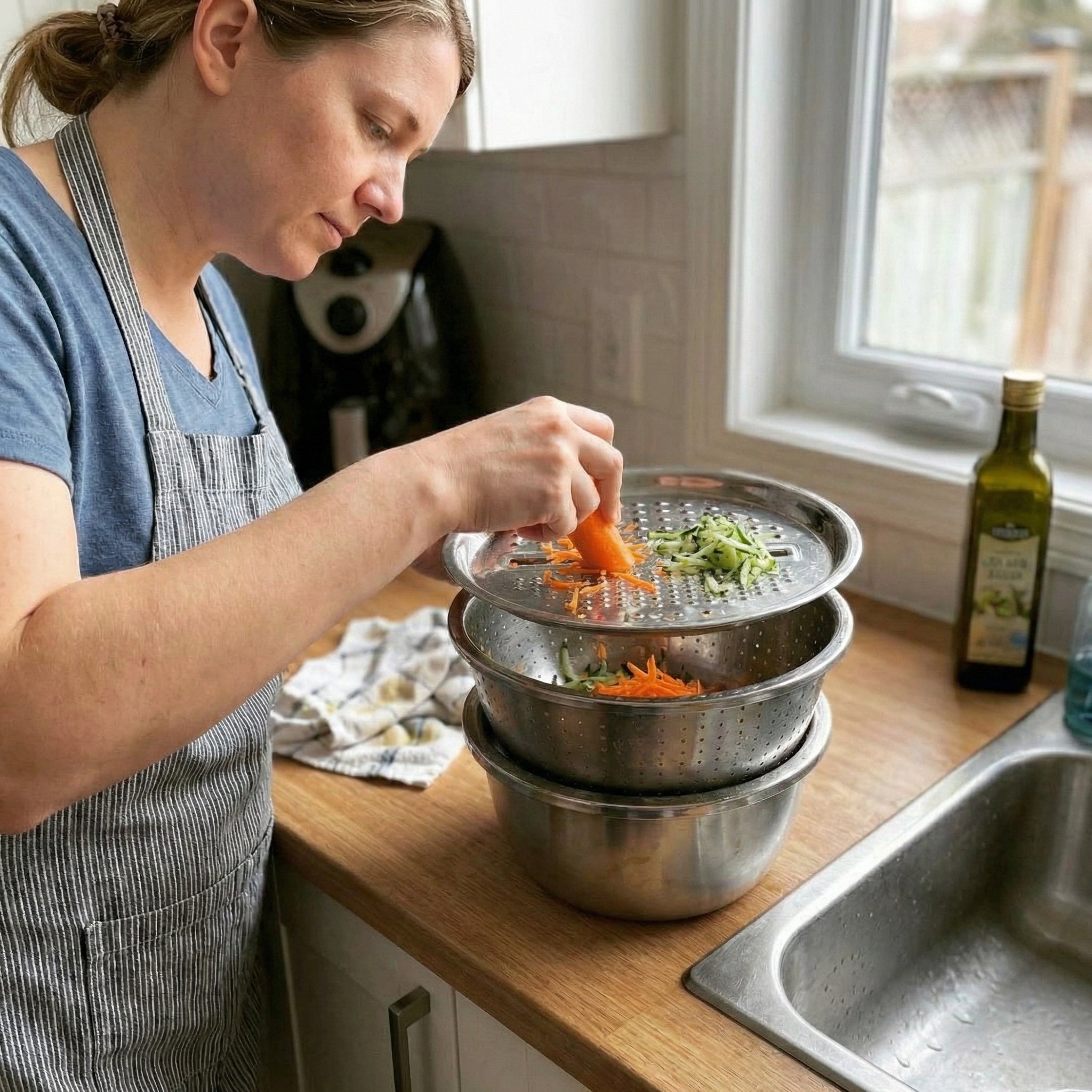 Absolutely. Rinse your produce in the basin, lift to drain instantly, grate directly into the bowl, and stack everything neatly when you’re done. No complicated setup, no extra attachments, and no learning curve. Because it’s stainless steel, it stays durable, easy to clean, and ready for daily use. Most people quickly stop thinking of it as a “multi-functional tool” and simply see it as their normal way of prepping — they just notice their kitchen feels calmer, cleaner, and more under control.